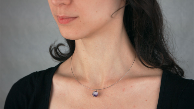 L'améthyste (naturelle) a des incrustations de quartz qui lui donnent de jolis motifs et variations de couleurs du violet foncé et transparent au violet clair et mat. Elle a des vertus apaisantes, elle calme l'angoisse et la colère, apporte sagesse et créativité.