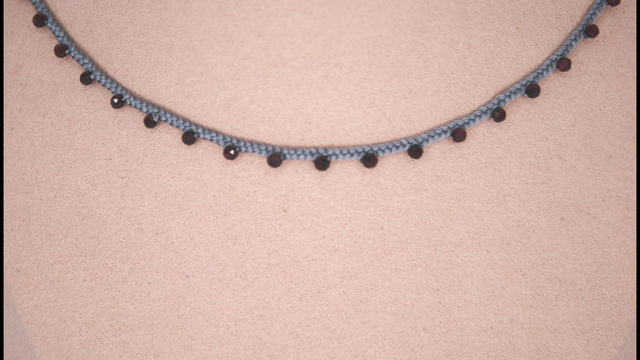 Très élégant collier ras de cou en soie argentée tressée et en pierres fines facettées.