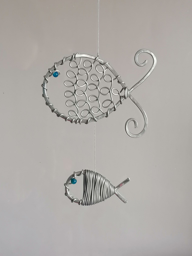 Suspension maman (ou papa) poisson avec son bébé. Leurs yeux sont en agate bleue.